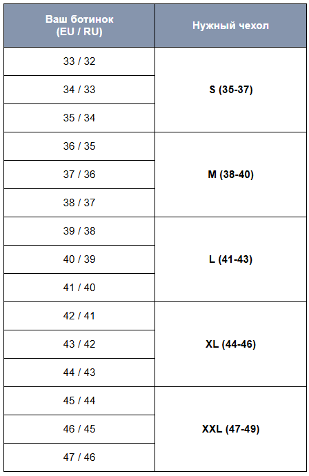 Подбор размера: Внимание! Данная модель сильно маломерит. Для комфортной посадки мы рекомендуем выбирать чехлы на 2 размера больше вашего размера ботинок. Воспользуйтесь таблицей ниже для точного определения подходящего размера.