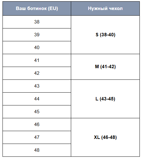 Подбор размера: Чехлы имеют широкую колодку и предназначены для надевания поверх вашей основной обуви. Воспользуйтесь таблицей ниже для точного определения подходящего размера.