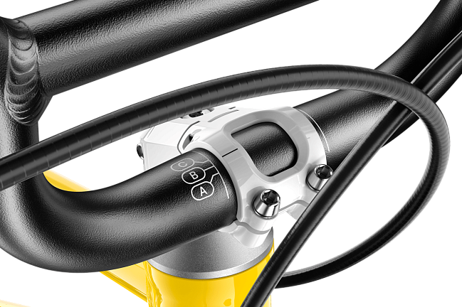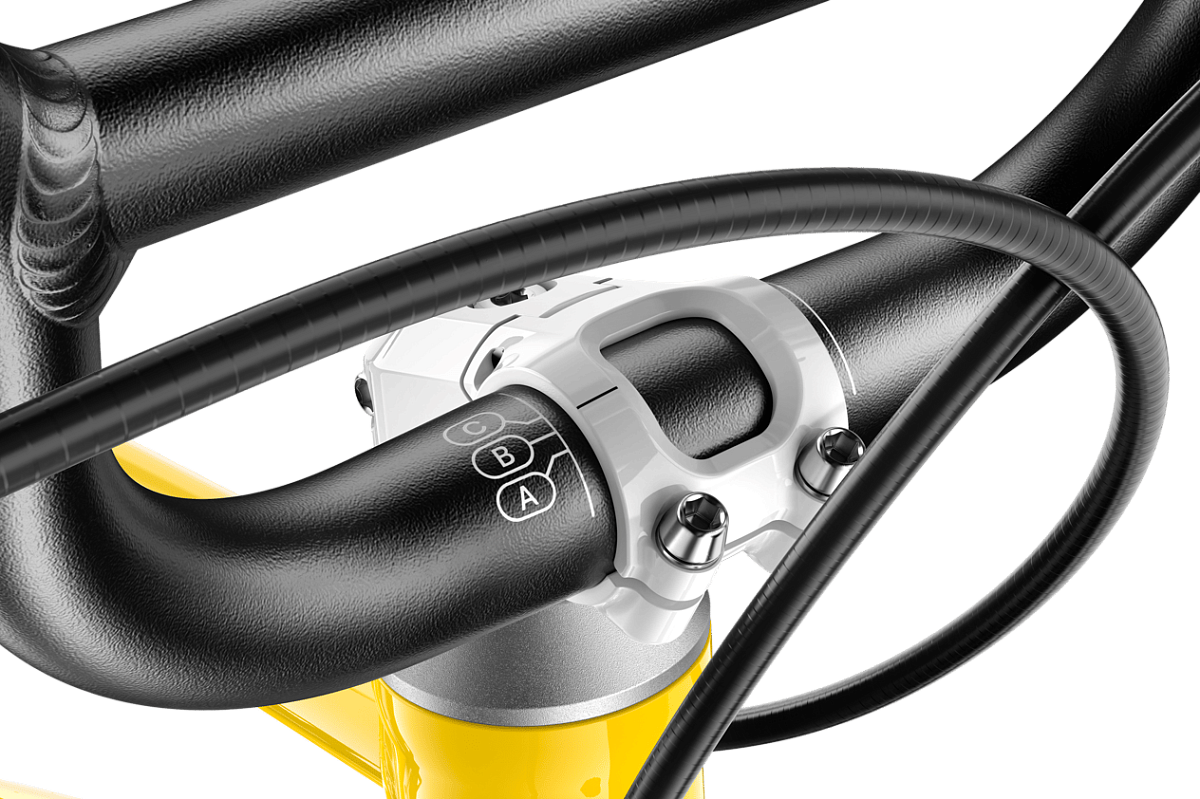 Интеллектуальная буквенная маркировка на руле и подседельном штыре для точной настройки посадки по мере роста ребенка. В линейке GO используется безопасный вынос (скрытые болты), в EXPLORE — регулируемый вынос Vario (настройка по высоте и вылету), в OFF — спортивный вынос Flip-Flop (+/- 15°).