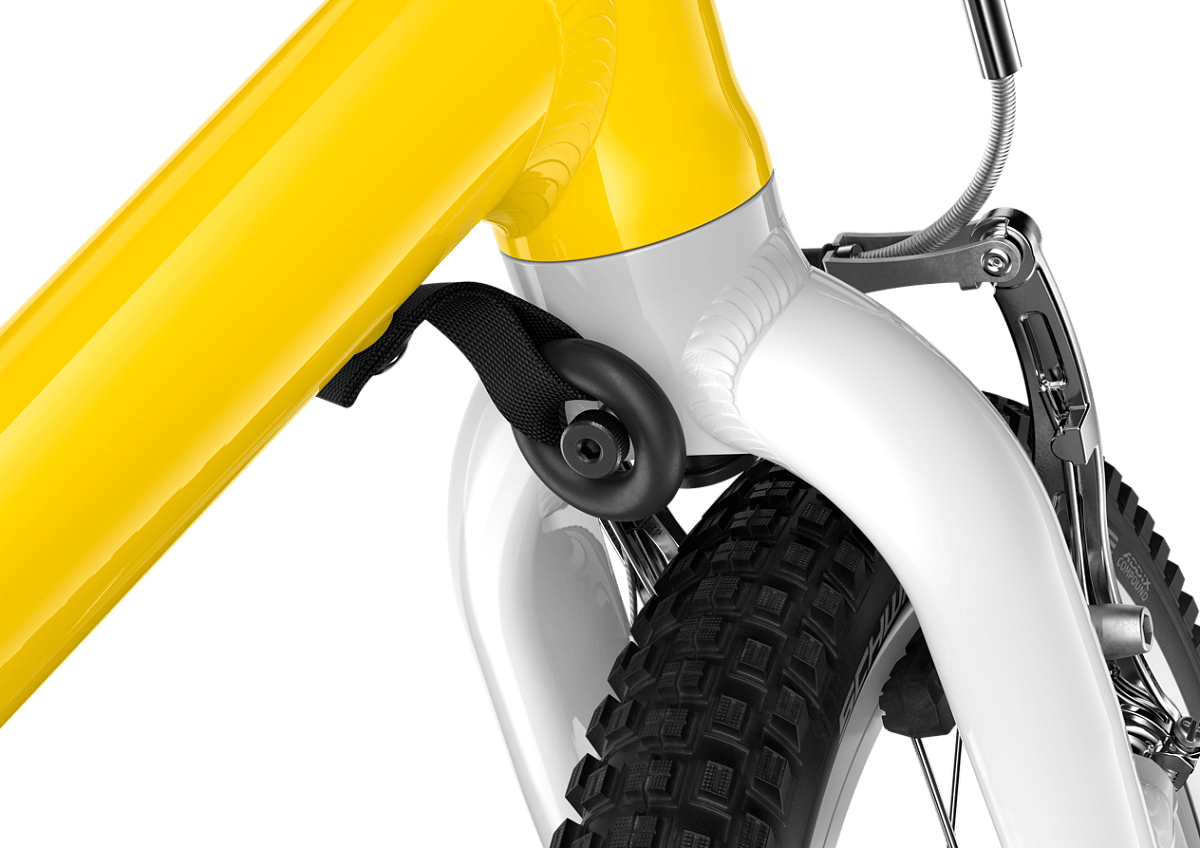 Правый тормозной рычаг и задние колодки V-brake окрашены в яркий зеленый цвет. Малыш легко запоминает правило «зеленый — безопасно» и рефлекторно использует задний тормоз, что исключает риск перелета через руль при экстренной остановке.