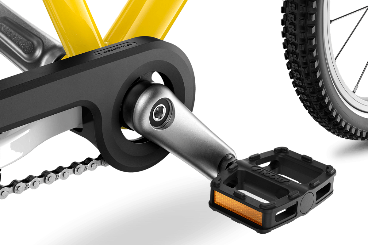 Шатуны спроектированы строго с учетом детской анатомии: расстояние между педалями сведено к минимуму. Это соответствует узкому тазу ребенка, предотвращая V-образное разведение ног. Обеспечивает эргономичное педалирование, защищает суставы и передает энергию без потерь.