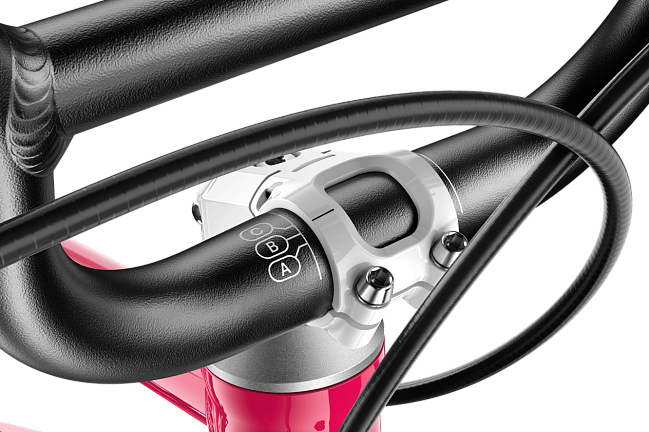 Интеллектуальная буквенная маркировка на руле и подседельном штыре для точной настройки посадки по мере роста ребенка. В линейке GO используется безопасный вынос (скрытые болты), в EXPLORE — регулируемый вынос Vario (настройка по высоте и вылету), в OFF — спортивный вынос Flip-Flop (+/- 15°).