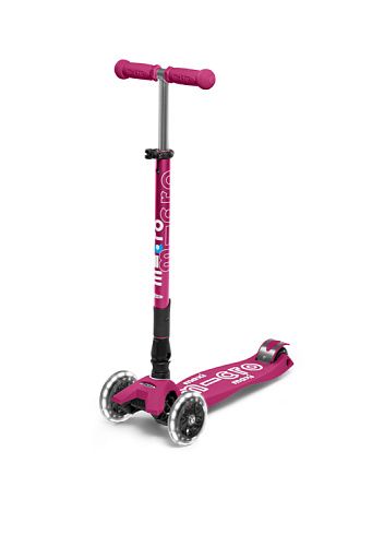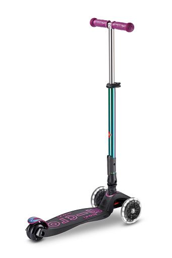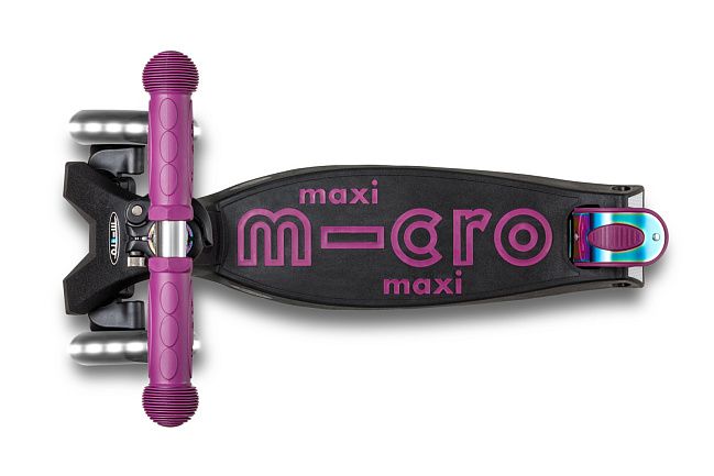 Складной Maxi — удобно брать везде! Micro Maxi Deluxe LED складной оснащён механизмом складывания стойки руля: компактный размер позволяет положить самокат в сумку или багажник автомобиля, не занимая много места. LED-колёса светятся без батареек.
