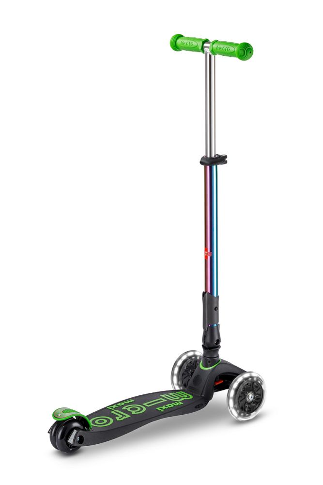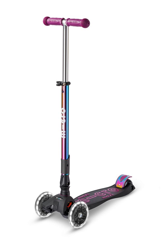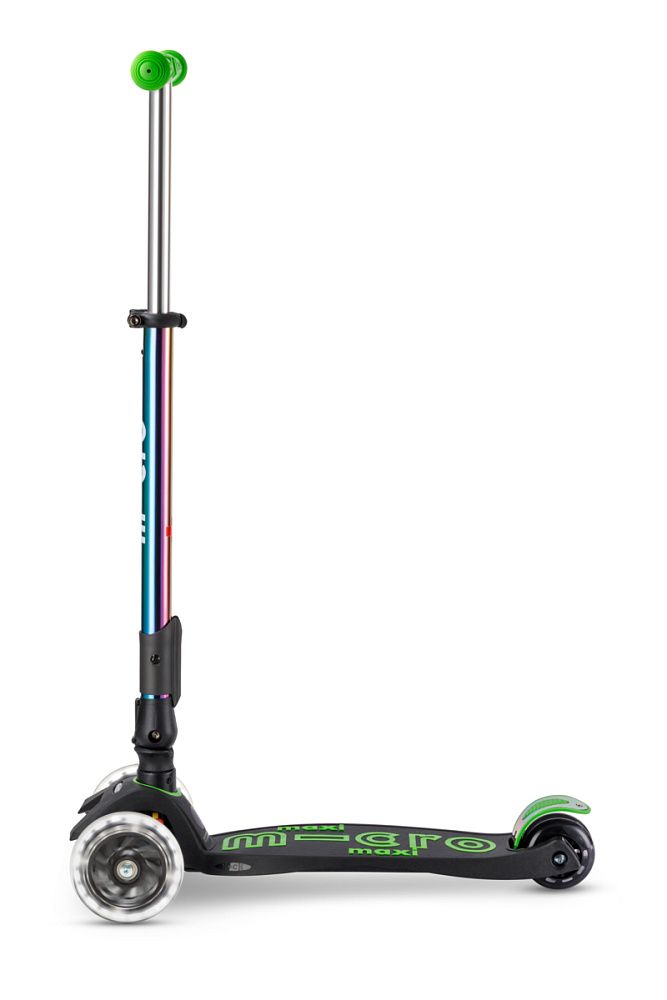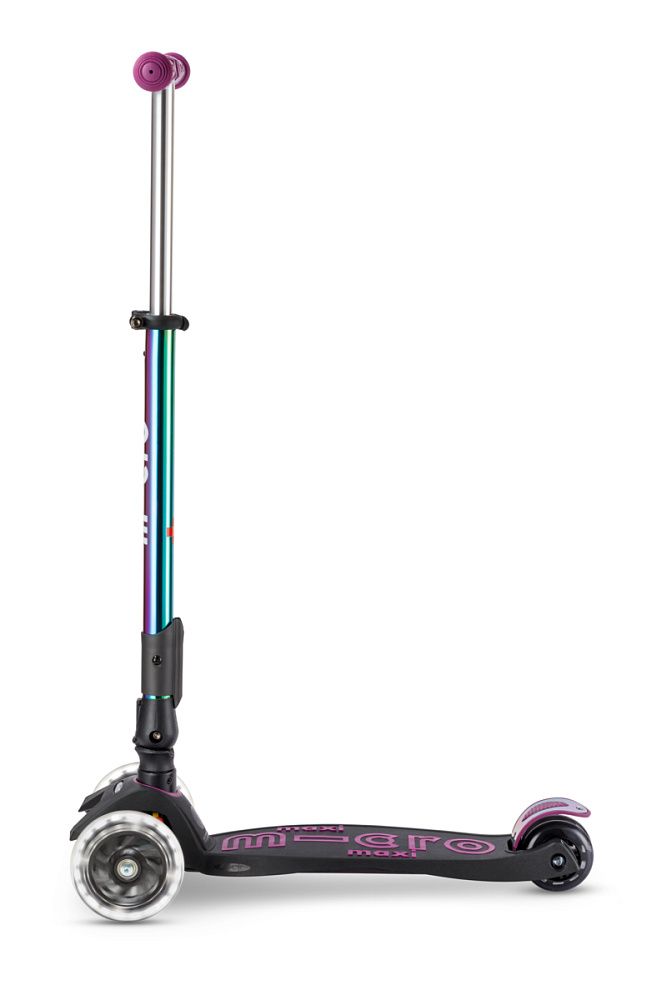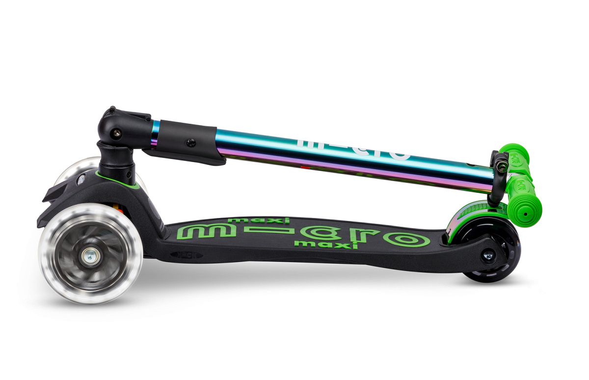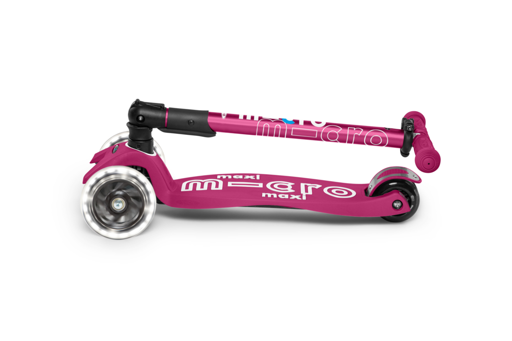 Складной Maxi — удобно брать везде! Micro Maxi Deluxe LED складной оснащён механизмом складывания стойки руля: компактный размер позволяет положить самокат в сумку или багажник автомобиля, не занимая много места. LED-колёса светятся без батареек.