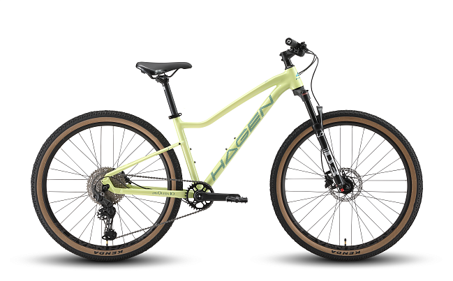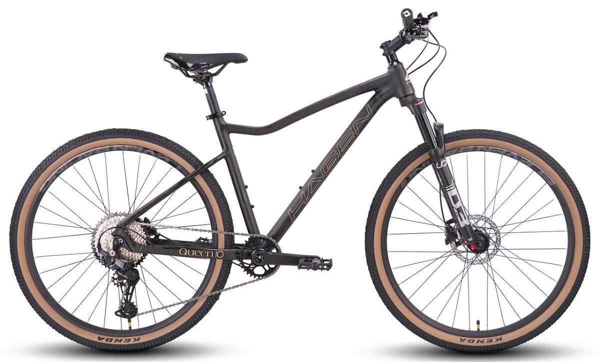 Верх женской линейки Queen — это уже не «покатать в парке», а честный кросс-кантри и фитнес. Hagen Queen 10 — алюминиевая рама с внутренней проводкой тросов и конусным рулевым стаканом, а впереди воздушная вилка D3 AIR с ходом 100 мм и регулировкой отскока: жёсткость настраивается под вес конкретной райдерши, а не «как у всех».