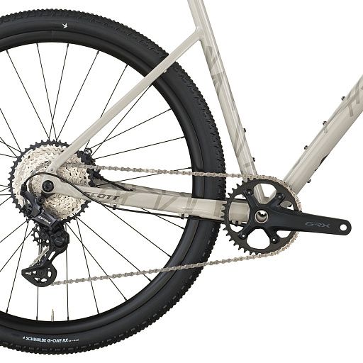 Трансмиссия Shimano GRX 1×12 с системой 40T и кассетой 10–45T справляется с любым рельефом одной манеткой — от длинных асфальтовых перегонов до крутых грунтовых тягунов. Гидравлические тормоза Shimano BR-RX410 уверенно держат на мокром грунте. Цепкие покрышки Schwalbe G-One RX 700×45C на ободах Alex Race X25 Disc катят быстро и держат курс на щебне.