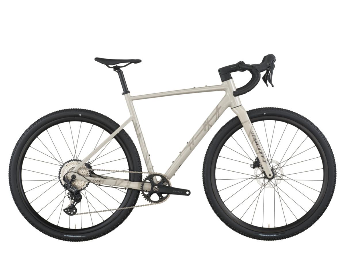 Трансмиссия Shimano GRX 1×12 с системой 40T и кассетой 10–45T справляется с любым рельефом одной манеткой — от длинных асфальтовых перегонов до крутых грунтовых тягунов. Гидравлические тормоза Shimano BR-RX410 уверенно держат на мокром грунте. Цепкие покрышки Schwalbe G-One RX 700×45C на ободах Alex Race X25 Disc катят быстро и держат курс на щебне.
